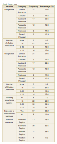 In terms of research output, 85.5 percent had published 1-5 articles. Regarding academic position, Clinical Instructors formed the largest group (27.6%). Most respondents (61.8%) had conducted 1-5 research studies, and 39.5 percent had 6-15 years of teaching experience. Professional development exposure was high, with 88.2 percent attending conferences or webinars on research publication. Representation spanned all regions of India, with the highest proportion from the Southern region (39.5%).