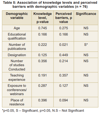 insufficient institutional support (65.8%), and limited research skills (61.8%) (Table 3). The correlation analysis revealed a statistically significant negative relationship between the knowledge of research publication and publication ethics and the perceived barriers among nursing teachers (r = -0.433, p < 0.001) (Table 4). The analysis showed no statistically significant association between knowledge levels regarding research publication and publication ethics and the selected demographic variables. However, there was a statistically significant association between perceived barriers and the number of publications (p = 0.021), indicating that faculty members with fewer publications experienced higher levels of perceived barriers.