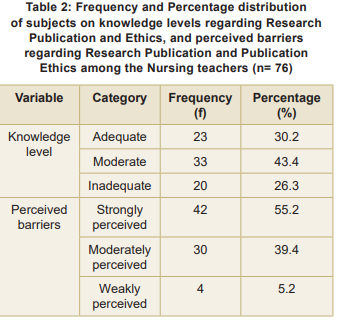 The findings showed (Table 2) that knowledge regarding research publication and publication ethics among nursing teachers was suboptimal, with the largest proportion (43.4%) demonstrating moderate knowledge. Perceived barriers to research publication and ethical compliance were notably high. More than half of the respondents (55.2%) reported strong barriers.